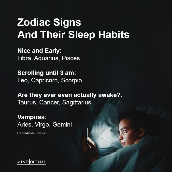 Sleeping Habits As Per Your Zodiac Sign | Times of India "When it comes to the decor of their bedroom, they prefer simple and uncluttered spaces that arent overwhelming to the mind.. Solo Retreat- When Pisces is feeling down or drained, getting away from everything is the best medicine. Sleep- If allowed, Pisces could easily sleep all day, and sometimes they do. These people are born with an artistic mind. Have a Good Cry- Theres no getting around the fact that Water signs, and Pisces in particular, are emotional creatures, so why not take advantage of it. To keep himself accountable when it came to training, Jay teamed up with a personal trainer friend and they worked out at the gym together three to four times most weeks. botanical blend of premium ingredients can help you reconnect with a reliable sleep schedule. To get better sleep for yourself, the best place to start may be to fix your child's sleep schedule first. But, once you get into your deep slumber, you'll be hard to wake up. Webby Stephen Sansa Uncategorized Zodiac Signs And Their Sleep Habits Nice and Early: Libra, Aquarius, Pisces Scrolling until 3 am: Leo, Capricorn, Scorpio Are they ever even actually awake? "They may find that there is, which will give them the confidence to trust the visions being shown to them in their slumber.. AIR GROUP SIGNS: It is hardly possible for air group signs, which are very talkative and attract attention almost in every environment they enter. Romance, empathy, nonmaterial love,